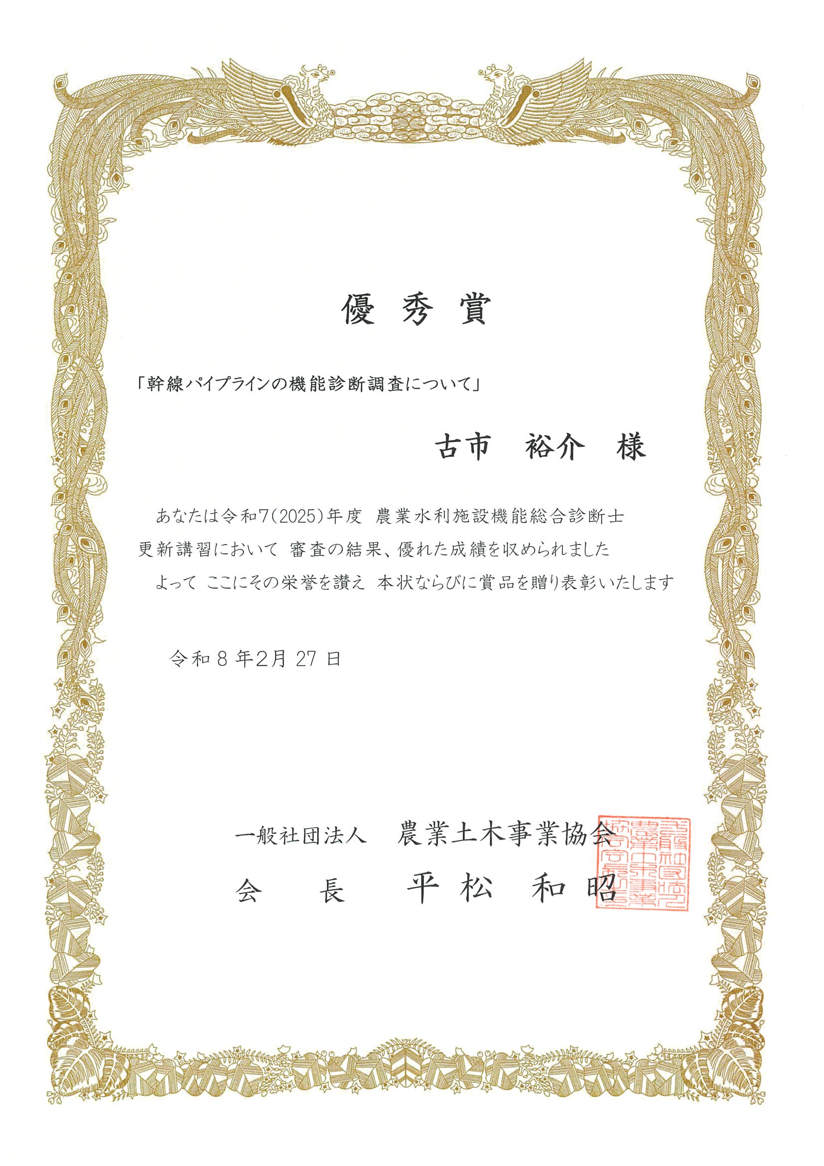 この度、当社調査部長 古市が「令和7年度 農業水利施設機能総合診断士登録更新」において提出した業務経験レポートが、(一社)農業土木事業協会の審査により、「優秀賞」に選定されました!
